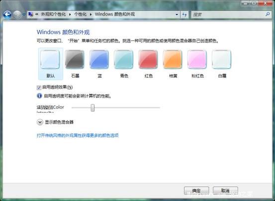 我们可以控制面板\外观和个性化\个性化\Windows 颜色和外观打开关闭Aero效果,并且还可以选择不同的色调,Aero透明效果的程度也是能够自定义的。