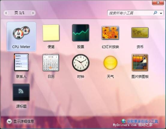 可以选择添加于边栏的小工具,微软网站还提供了更多小工具的下载。