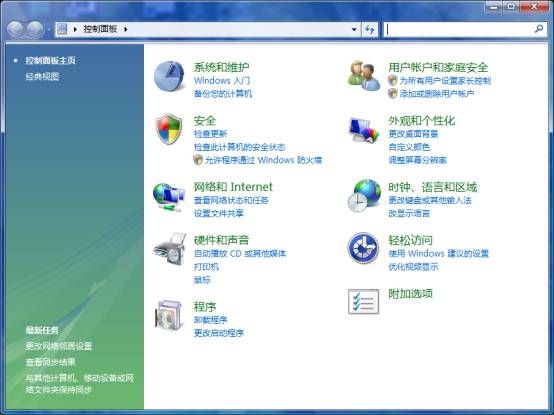 Vista默认设置的控制面板采用主分类带小分类的办法,让我们对功能需求设置更加一目了然,当然你也可以切换经典视图方式来回归传统。
