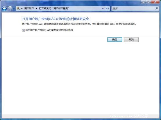 用户界面中去掉对勾重启系统即可完成UAC的关闭。
