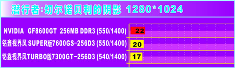 GeForce 8500在这款游戏中只跑出了可怜的2帧(最高画质设定),画面一秒2帧,远低于24帧/秒的最低流畅要求,DEMO成了名副其实的“幻灯片”。GeForce 8600GT的性能“相当不错”,帧速突破性的达到了3帧,但还是没有任何意义——只是一部更高级的幻灯片播放机罢了。