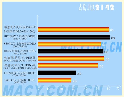 测试中HD2600XT DDR3和铭鑫8600GT以基本相同的成绩分处一二,而8500GT、铭鑫7600GS、铭鑫7300GT、HD2600PRO这几款在其它测试中差别较大的产品竟然都以50帧/秒以上的速度处于第二梯队。这说明这款游戏的显卡区分度并不好,但这种区分度不好的游戏并不在少数,事实就是这样。