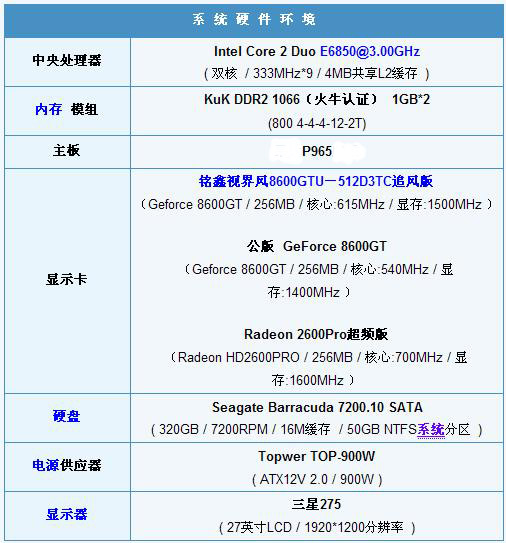 硬件平台选用了主流的Intel Core 2 Duo E6850@3.00GHz、昂达P965魔戒和KuK DDR2 1066(火牛认证)1GB*2,为了保证每篇测试成绩的可对比性。其他详细配置如下:
