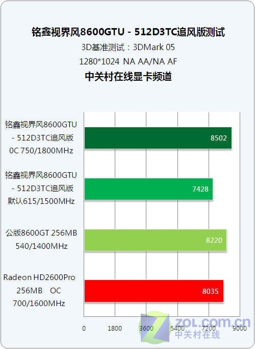 因为铭鑫视界风8600GTU-512D3TC追风版的价格只需要599元,但是相比849元的公版8600GT和699元高频2600PRO,综合性能基本持平,所以其该卡的性价比非常出色。