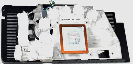 我们将显卡的一体式散热器拆下来观察。可以看到这个散热器负责GPU、显存、供电部分的散热,做工还是不错的,实际使用过程中也能得到很好的散热效果,保证玩家长时间使用的稳定。8800GT的散热器全部采用单卡位设计,完全避免了在一些主板上阻碍其他扩展接口的麻烦,同时有利于机箱内部气体流动。