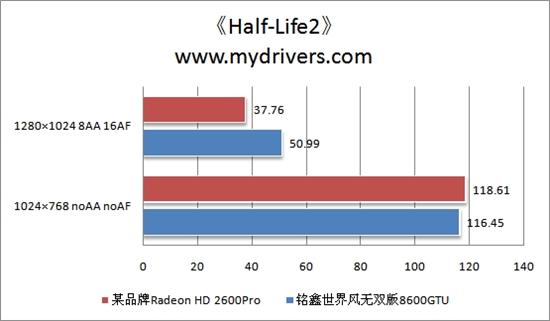 两款DirectX 9游戏中除了《Half-Life2》中的第一项铭鑫8600GTU落后之外其余项目均全面领先,特别是在全屏抗锯齿测试中差距达到了十几帧。