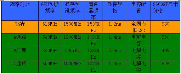 在这里还要特别提醒一下广大消费者,有部分厂商在送测和媒体播报行情的时候使用高频的产品,但是实际零售时却销售低频率的产品,如果频率相差不大也许还可以理解,但是频率相差过大就真的有点。。。。。。某厂商的8600GT就曾公开宣称其某款8600GT产品默认出厂工作频率为核心650MHZ,显存1800MHZ,但是实际摆到市场上销售的时候却变成了600MHZ核心 1400MHZ显存频率,核心频率缩水10%,显存频率缩水25%,这不得不让 消费者对某些厂商的诚信发出质疑。