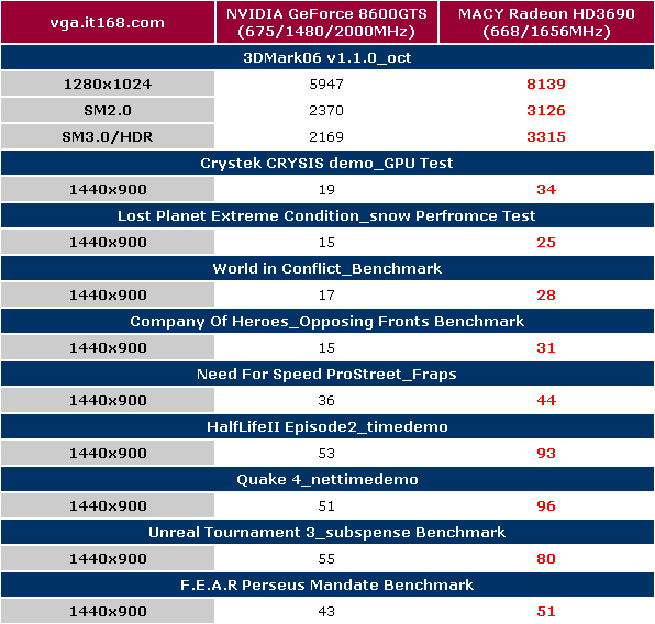 因此,在699元附近这个价格档位上,NVIDIA把机会留给了ATI,当GeForce 9500GT尚未登录前,Radeon HD3690则有着不少的发挥机会,成为该价格段中性价比最高的产品。