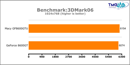在3DMark06的测试中,铭鑫8600GTU凭借着其较高的核心/Shader频率,不仅弥补了其显存频率相对较低的不足,并且使得其在三种分辨率下的性能表现均要优于公版8600GT