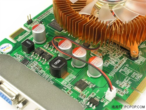 显卡采用核心、显存分体式供电方式,核心供电模块在显卡前端,而显存供电模块在显卡尾部。供电部分采用的是封闭式防磁电感以及固态电容,经常看我们行情报道的读者相信已经看出来了,电容采用的是日本富士通固态聚合物电容,据说成本不低。