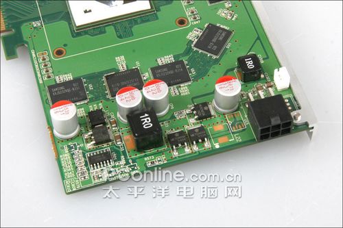 铭鑫 视界风 9800GTU-512D3中国玩家版采用了三相供电的设计,其中核心占有两相显存占一相,采用优质的固态电容打造,提供6Pin外接电源接口。