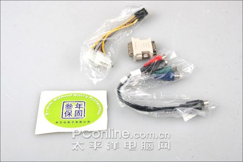 附件方面,视界风9600GTU中国玩家版提供色差线,DVI转VGA接头和6PIN电源转接线。另外还有一张叁年保固的贴纸,用户可将该贴图贴在机箱上作为提醒,笔者认为厂商能够提供三年保固的品质保证,说明其对该显卡的质量非常有信心。为用户提供叁年保固的服务,同时也为产品增加更多的附加值。