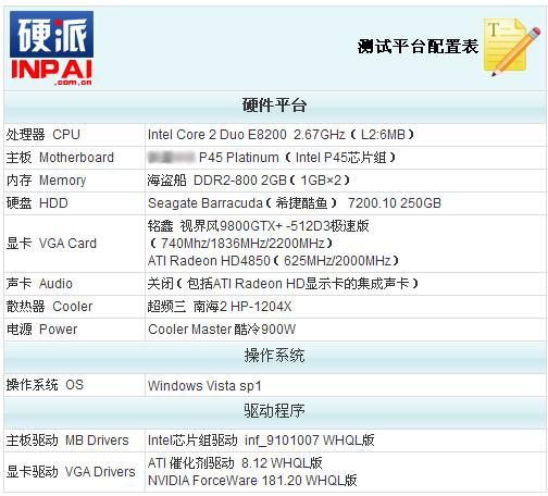 测试项目全部为目前对系统配置要求比较要的热门游戏,以及权威3D图形测试软件3DMark VANTAGE。对比显卡我们选择了GeForce 9800GTX+的直接竞争对手Radeon HD4850,让他们直接较量。