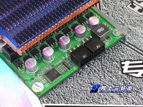 当然这么高的频率是需要良好的设计以及优秀的做工用料保证的,从外观上我们可以看到这款铭鑫视界风狂飙版9800GTX+D显卡使用了4+2+1(其中一相供电为PCIE提供开关供电,更加稳定。)式的核心显存开关供电模块,更多相数的供电可以为显卡带来更加平稳的电流供给;而且这款铭鑫视界风狂飙版9800GTX+D显卡延续了铭鑫一贯的作风,采用了全固态电容与全封闭电感设计,可以保证整个显卡的电气性能。作为这样一款仅售899元的9800GT显卡,铭鑫并未通过缩水的方式来获得更多的利润,反而采用了英飞凌高品质MOS与意法半导体的供电控制芯片;为了保证散热,铭鑫还采用了百余元的超频三爱琴海散热器,用料不惜血本。