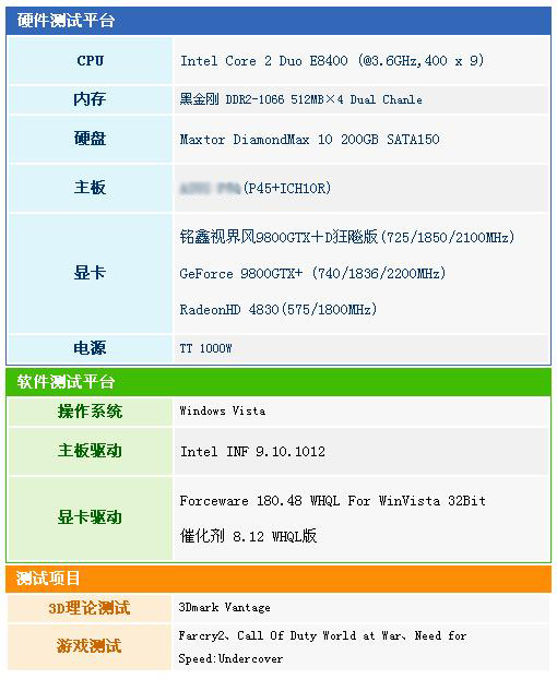 测试使用了E8400这款超频能力相当不俗的CPU,为了测试稳定只将其简单超频到3.6GHz,内存方面使用的是多条DDR1066实现2GB显存,,结合最新的Forceware 181.20 WHQL以求能够发挥最高性能。