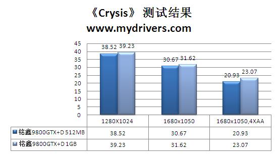 《Crysis》一向是考验显卡性能的标杆,除了游戏本身吸引人气之外,更重要的是《Crysis》可是说是DX10最高画质的代表,能流畅运行《Crysis》可以证明显卡的性能。铭鑫9800GTX+D可以在1280X1024分辨率下提供流畅的速度,1680X1050下基本合格,不过此时开启4XAA没有实际意义了,游戏速度损失明显,建议关闭为好。