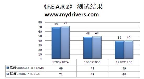《F.E.A.R2》中我们特意选择了最高特效,并自动开启4XAA和4XAF,铭鑫9800GTX+D依然可以在1920X1200分辨率下流畅运行,NV的182.08驱动为这款游戏做过优化,新驱动配合铭鑫9800GTX+D显卡为喜欢恐怖游戏的玩家带来了一个惊险刺激的游戏体验。