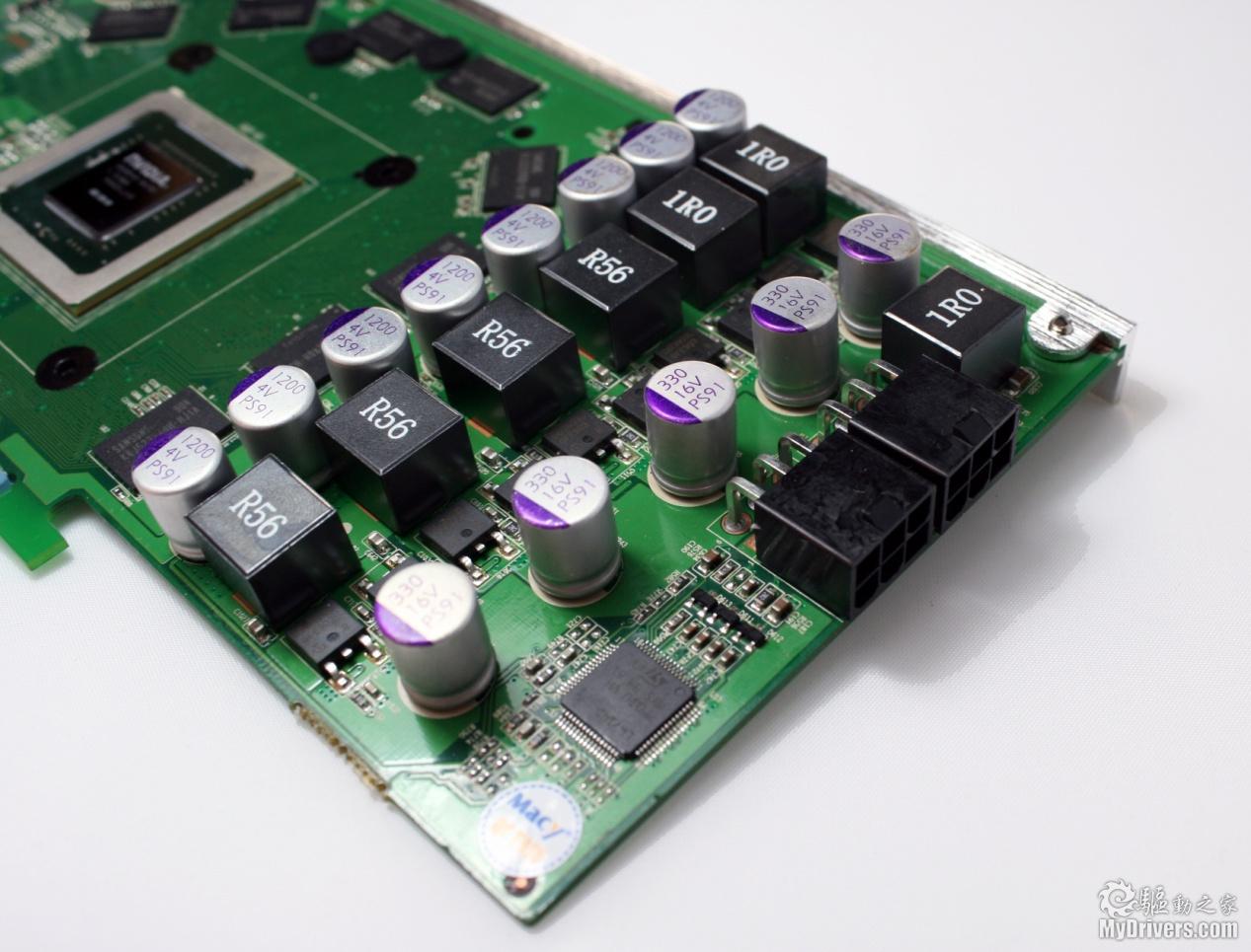 显卡的供电部分也常是厂商宣传的重点,GTS250D采用核心与显存独立的供电方式,板载紫色标识的三洋全固态电容及意法半导体生产的铁素体电感线圈加英飞凌原厂的MOSFET(场效应管)。而且,该卡采用的是大型PCB版能更好的散热,并采用七相供电(左侧1辅助,右侧4主供电和2相显存供电),为显卡稳定运行提供保障。