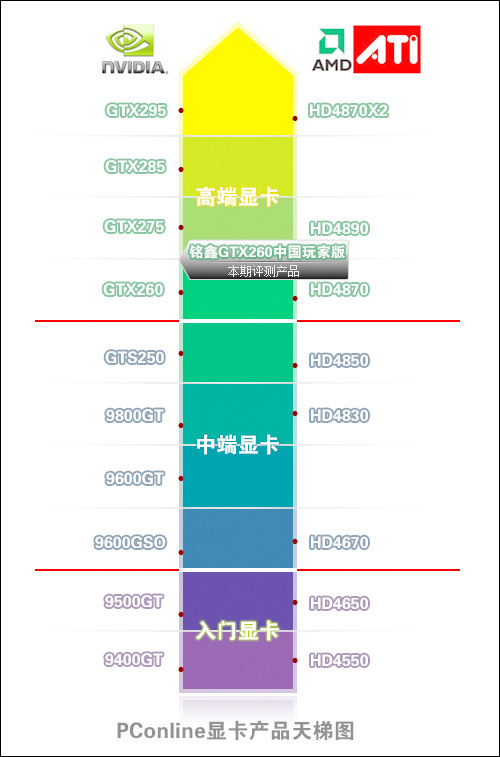 显然,默认工作频率十分高的铭鑫视界风GTX260+ 896D3中国玩家版在我们PConline显卡天梯图上居于GTX260+红点之上,直逼GTX275。