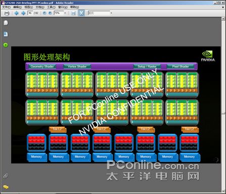 据Adobe平台产品营销总Pam Deziel表示,NVIDIA GeForce与Quadro GPU使用者可利用PDF档案进行更多样的作业,同时也能更有效率。包括平移、卷动、缩放等,实际上Adobe Reader 8每一项运用到GPU的功能都有着显著的效能增进。使用者过去避免使用的一些应用,例如可进行极精细比例缩放的地图,现在都可以轻易地显示。