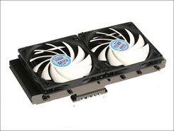 铭鑫视界风GTX260+ 896D3中国玩家版的两个大口径白色风扇十分抢眼,从方形的构造可知,该类风扇主要面向机箱散热,不过其大风流的优势通过超频三黑海五热管散热系统转接到该显卡中虽然散热效果不错,不过也出现了显卡整体厚度大的副作用,超过了普通双槽散热器的厚度,所以要占据主板3个PCI-E插槽。