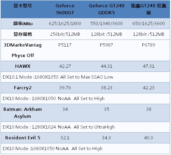 铭鑫GT240狂飙版将核心频率提升至于9600GT相同的650MHz,显存频率更是提高到3800MHz,超频后的GT240性能非常抢眼,性能提升幅度接近15%,3DMarkVantage成绩领先将近1000分,可见超频后对游戏性能提升还是相当可观的。
