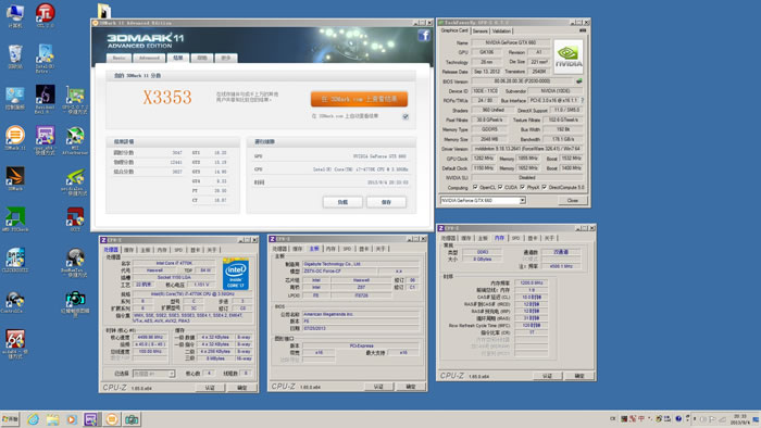 此次超频中所使用的BIOS为黑山老妖LYN特制版,默认频率1150MHz,Boost频率高达1400MHz,冰城黑龙使用破解版MSI Afterburnner软件把核心电压加到1.48V,核心频率拉到1532MHz,显存1855MHz,等效7420MHz的频率。测试平台使用技嘉的新一代Z87板王Z87X-OC Force,搭配特挑的1.15V 双4.5G的4770K。技嘉Z87X-OC Force最大的特点就是提供了SATA供电接口的显卡辅助供电接口,所以显卡超频非常给力。CPU散热器为安钛克的H900一体式水冷。此款水冷虽然扣具很狗血,但性能很强大,压4.7G的4770K都不在话下。