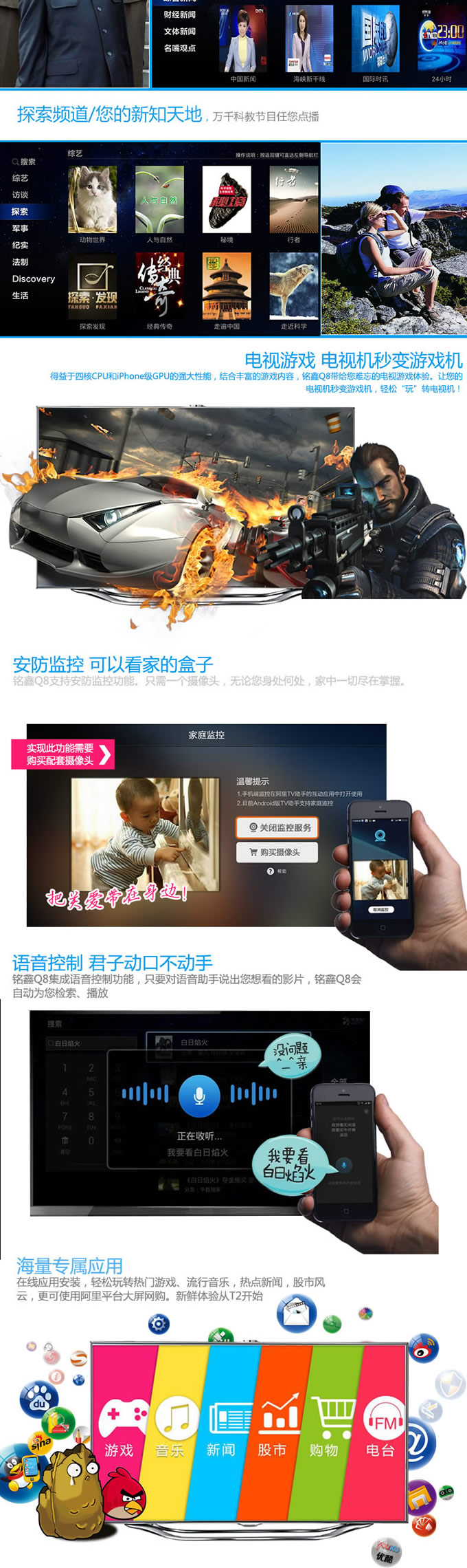 简单的与电视连接之后,可将电视机变成智能电视机,通过遥控器可观看网络正版影视;可将移动硬盘或存储卡接入接口就可以轻松在电视上观看各种格式的电影大片,以及高清图片,并支持在浏览图片的同时播放存储器中的音频和视频文件 ,集简易与实用性于一体。